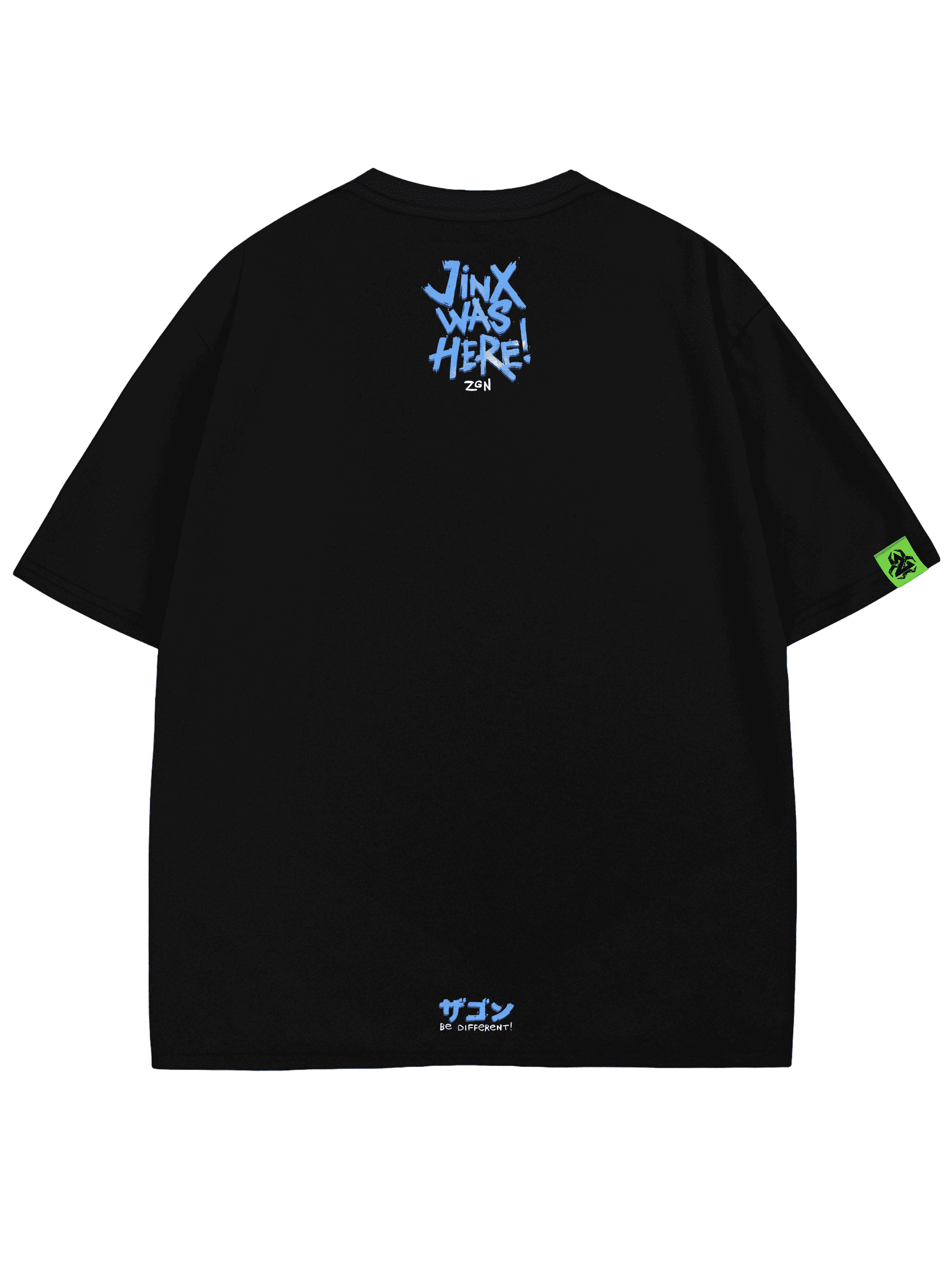 Футболка с держащей в руках фаер Джинкс, а на фоне — отголоски прошлого в лице близких ей людей, подчеркивающих память и прошлое героини.