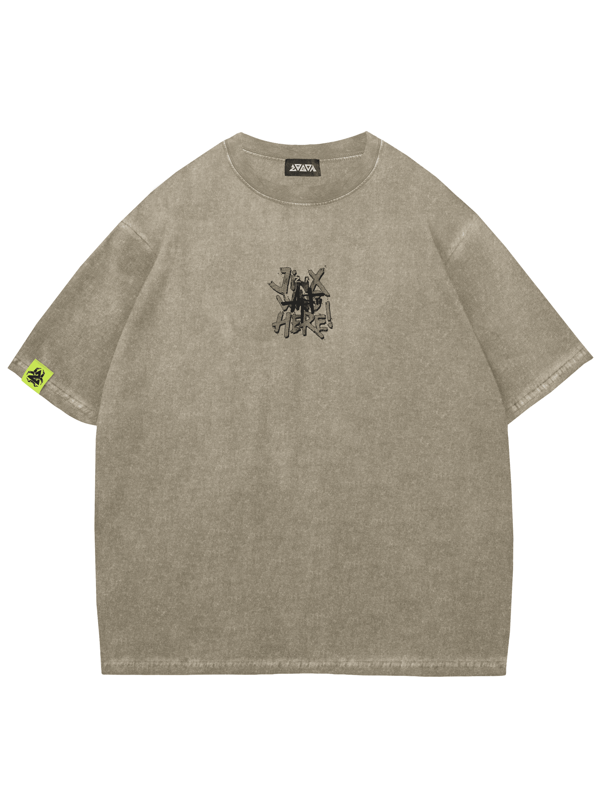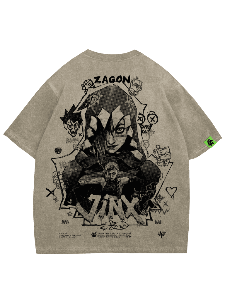 Stonewashed футболка в бежевом цвете и чёрной вариации с Джинкс, показанной «до» и после», что отражает её становление на протяжении всего пути и метаморфозу.