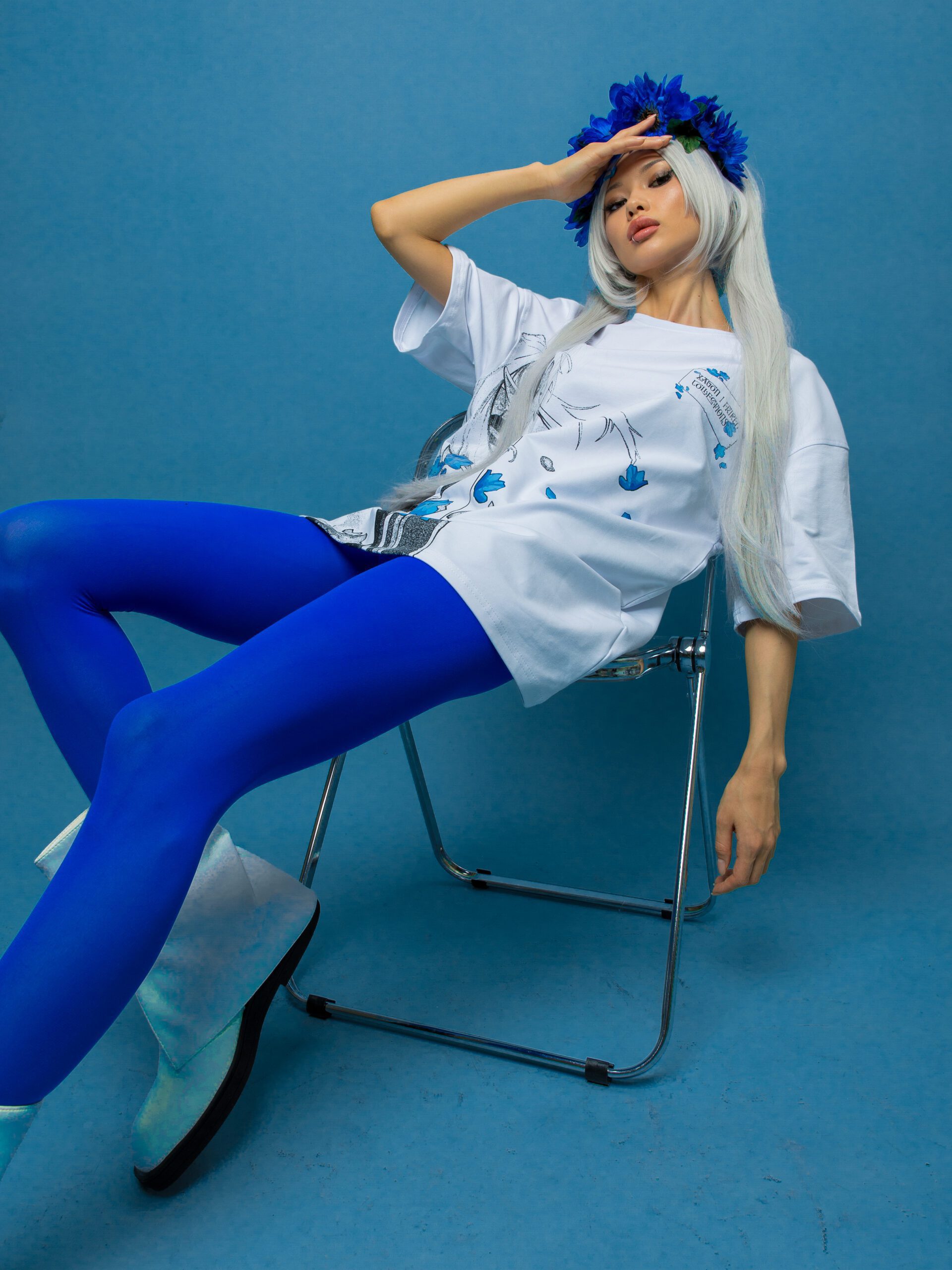 Вживую принт выглядит даже интереснее. Очень хорошо синие цветы подчеркивают черно-белый рисунок.