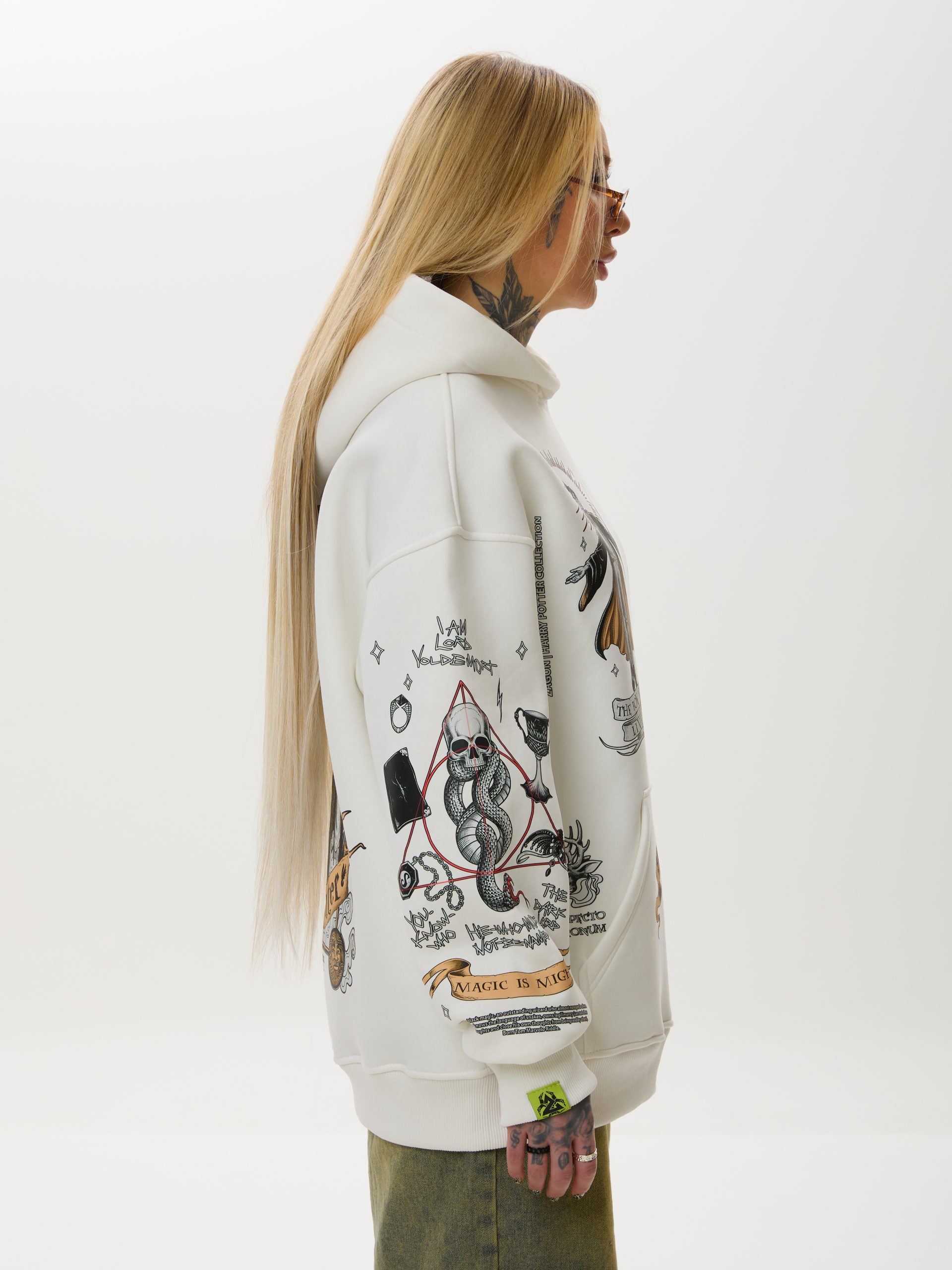 *Рукав худи спущеный, поэтому обратите внимание на длину плеча. Для того чтобы правильно измерить длину рукава нужно измерить длину плеча + длина рукава