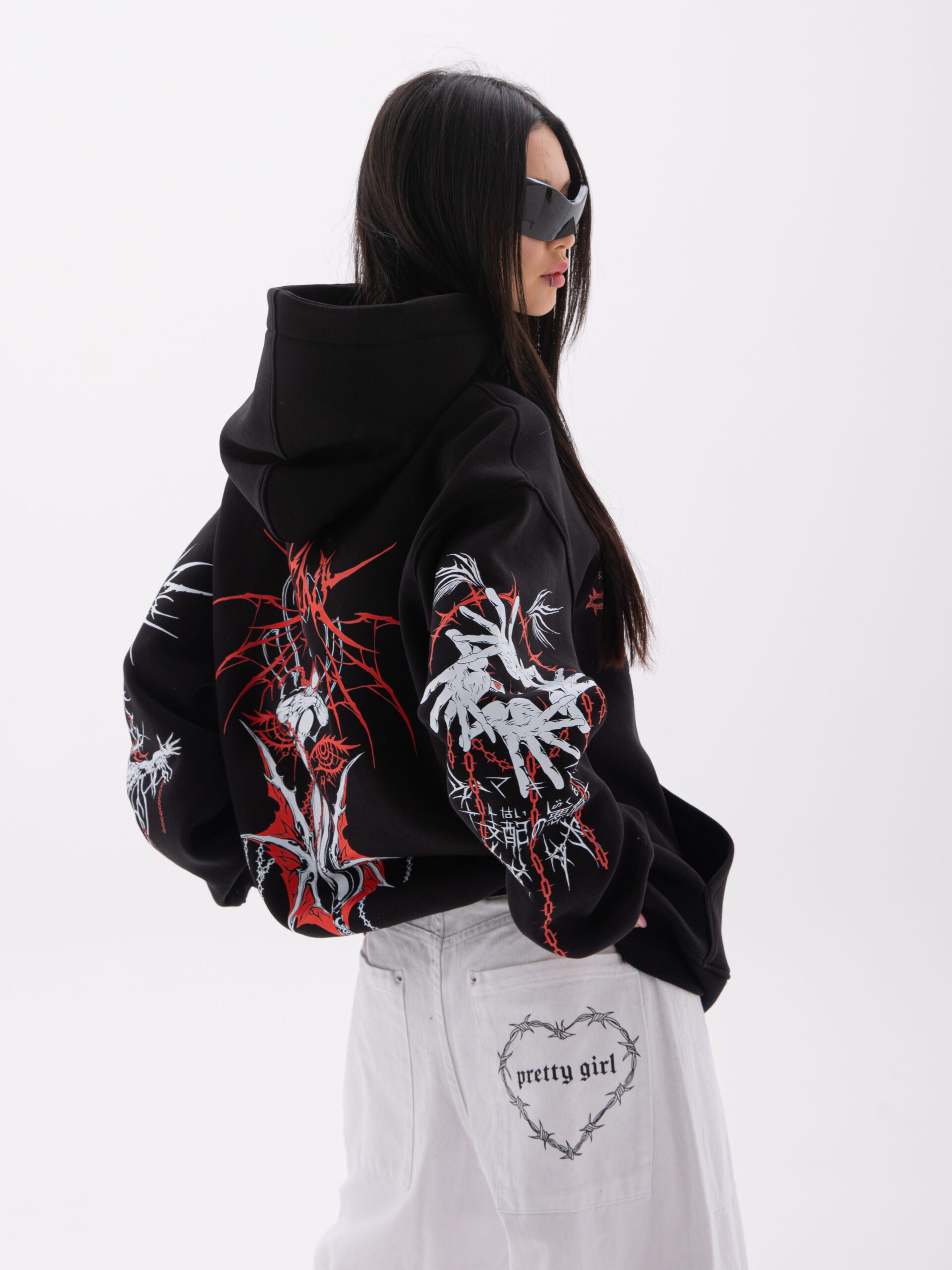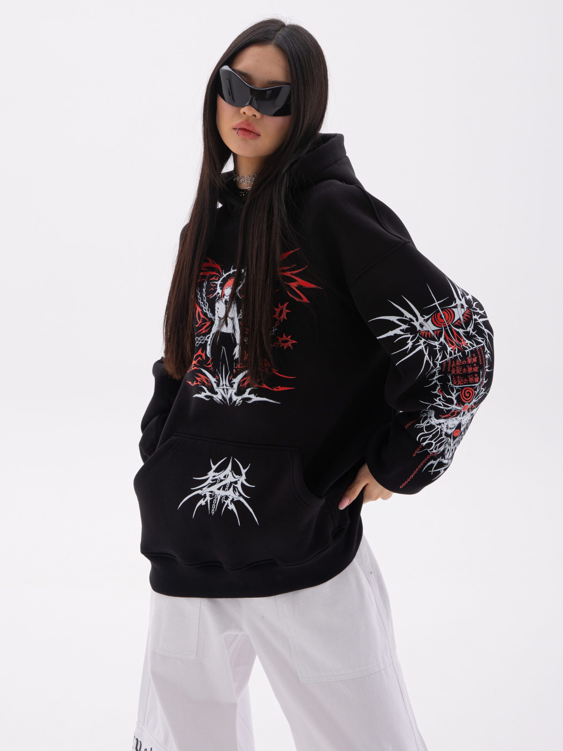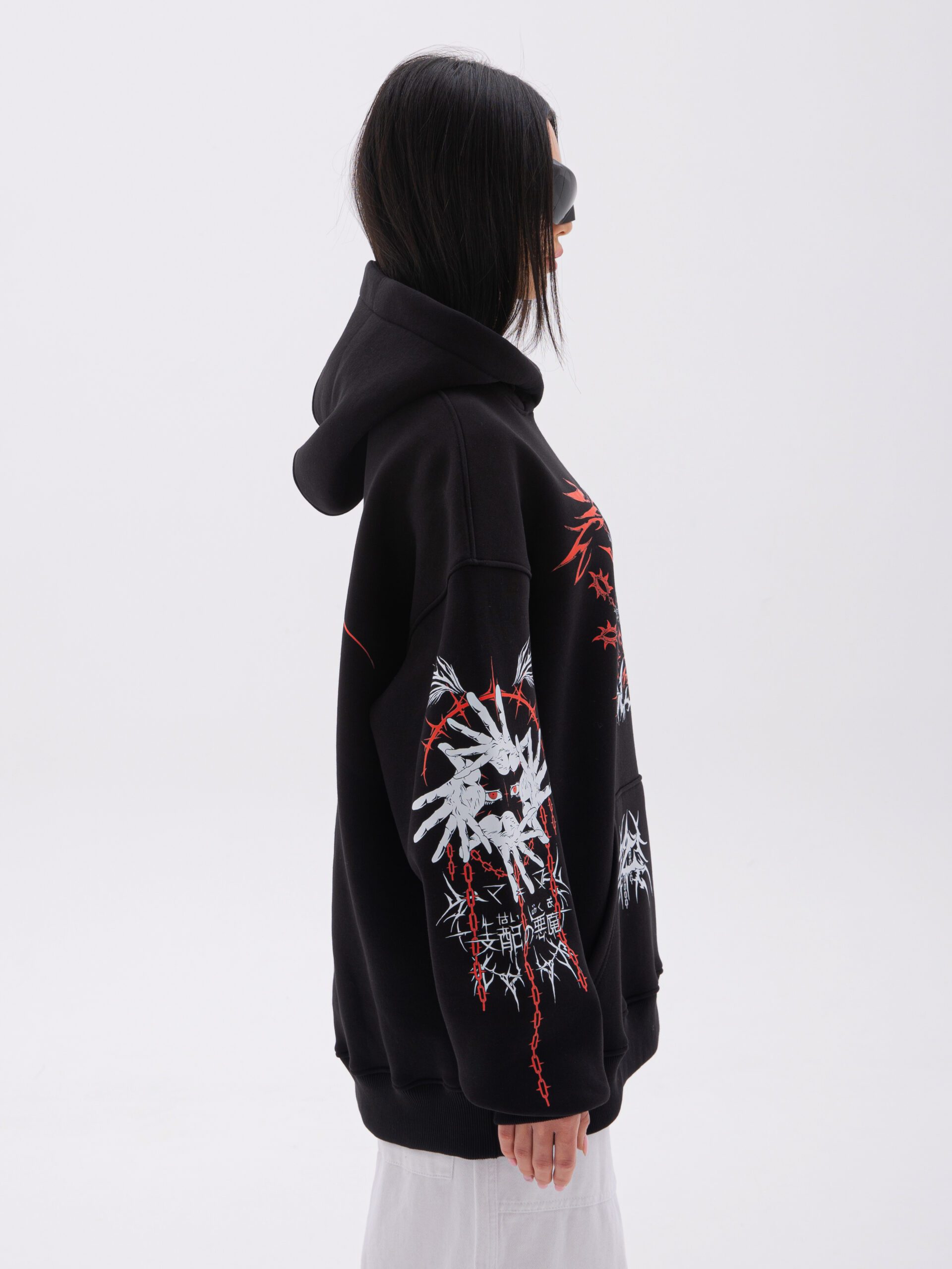 *Рукав худи спущеный, поэтому обратите внимание на длину плеча. Для того чтобы правильно измерить длину рукава нужно измерить длину плеча + длина рукава