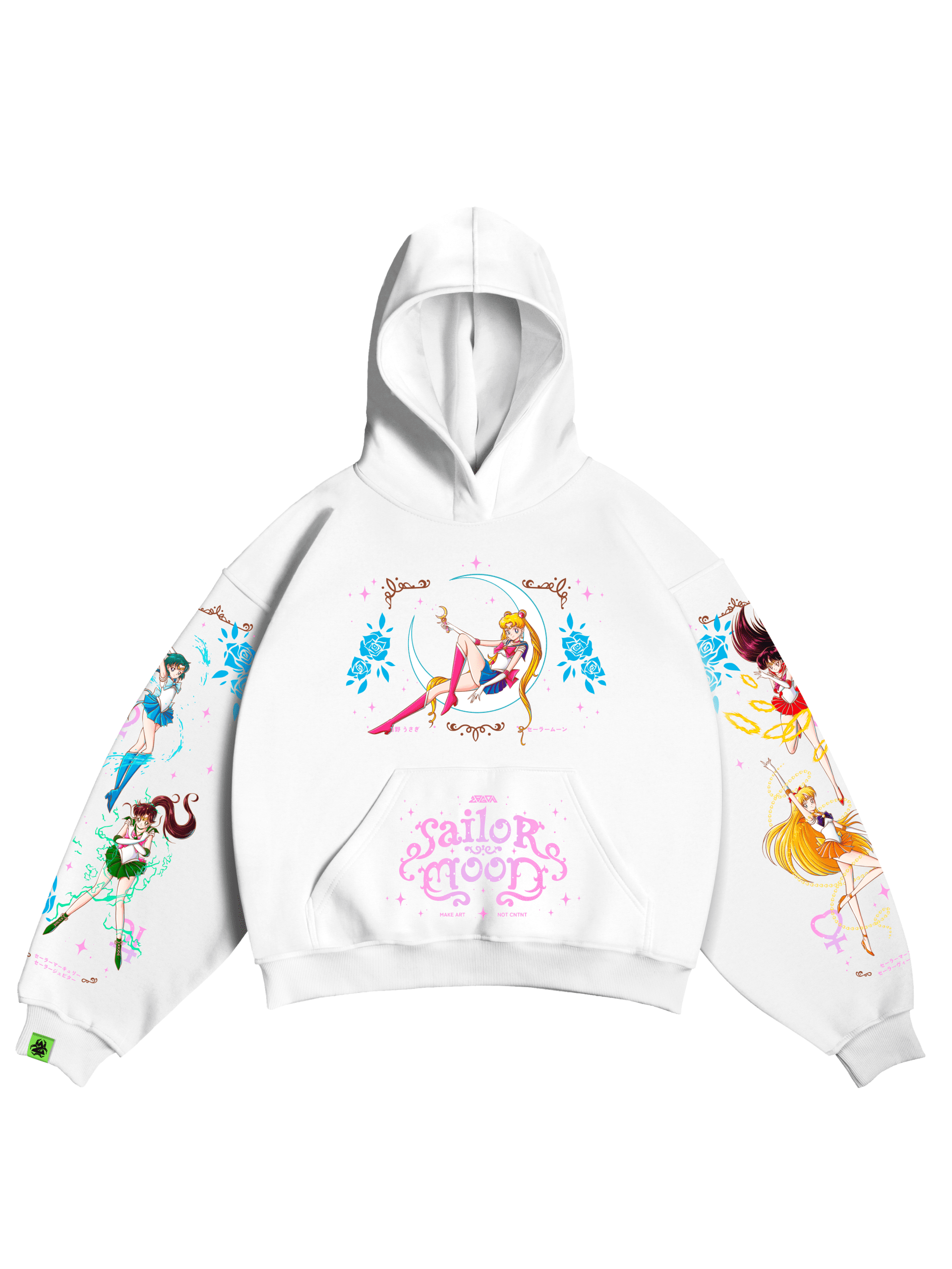 На груди — культовый образ Сейлор Мун в боевой позе, окружённый символами луны и нежными розами.