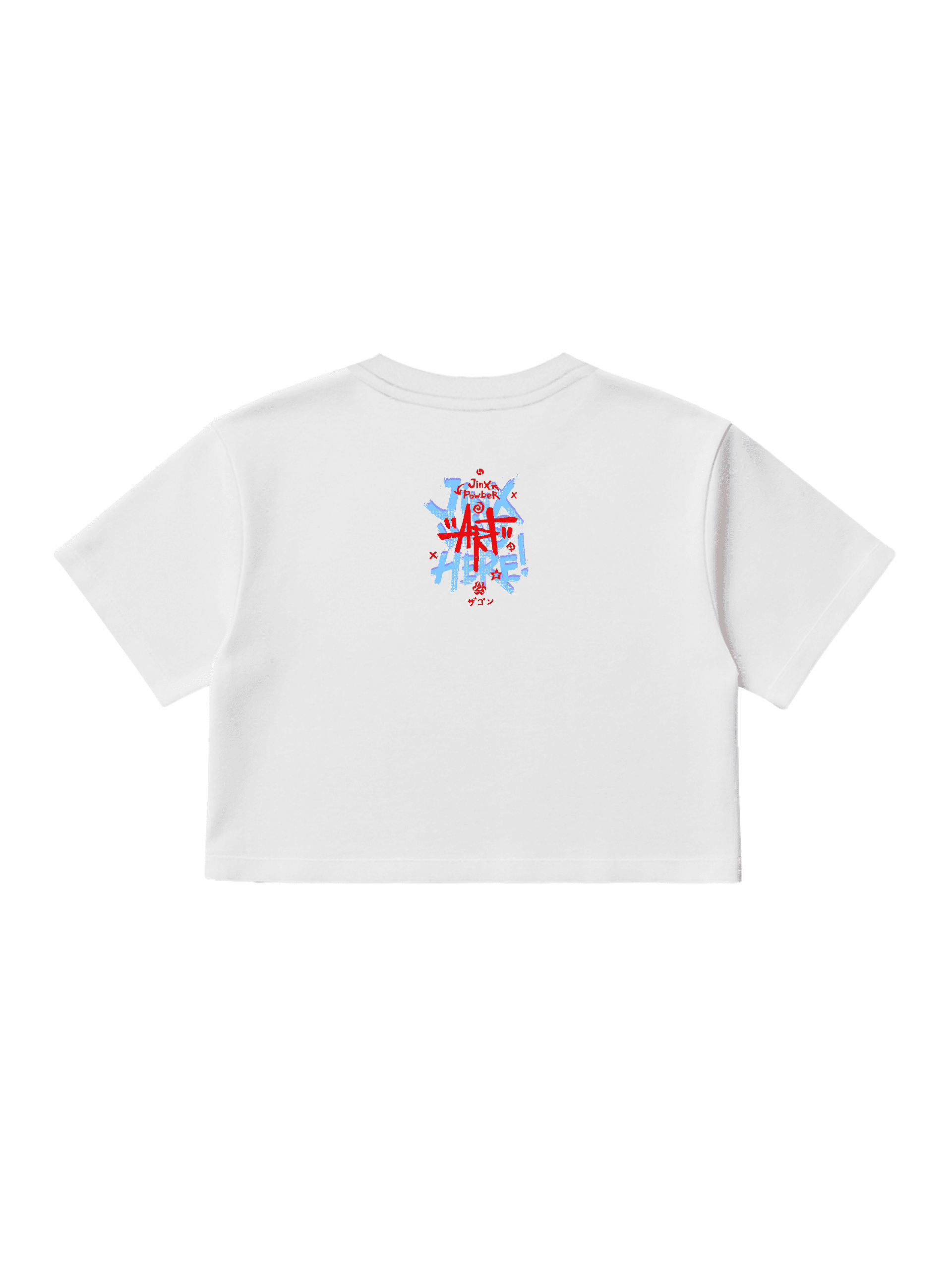 Кроп-футболка с лаконичным кроем, фирменными гранатами «кусаками» Джинкс и элементами, отсылающими к её личности, а также надписью «JINX WAS HERE»