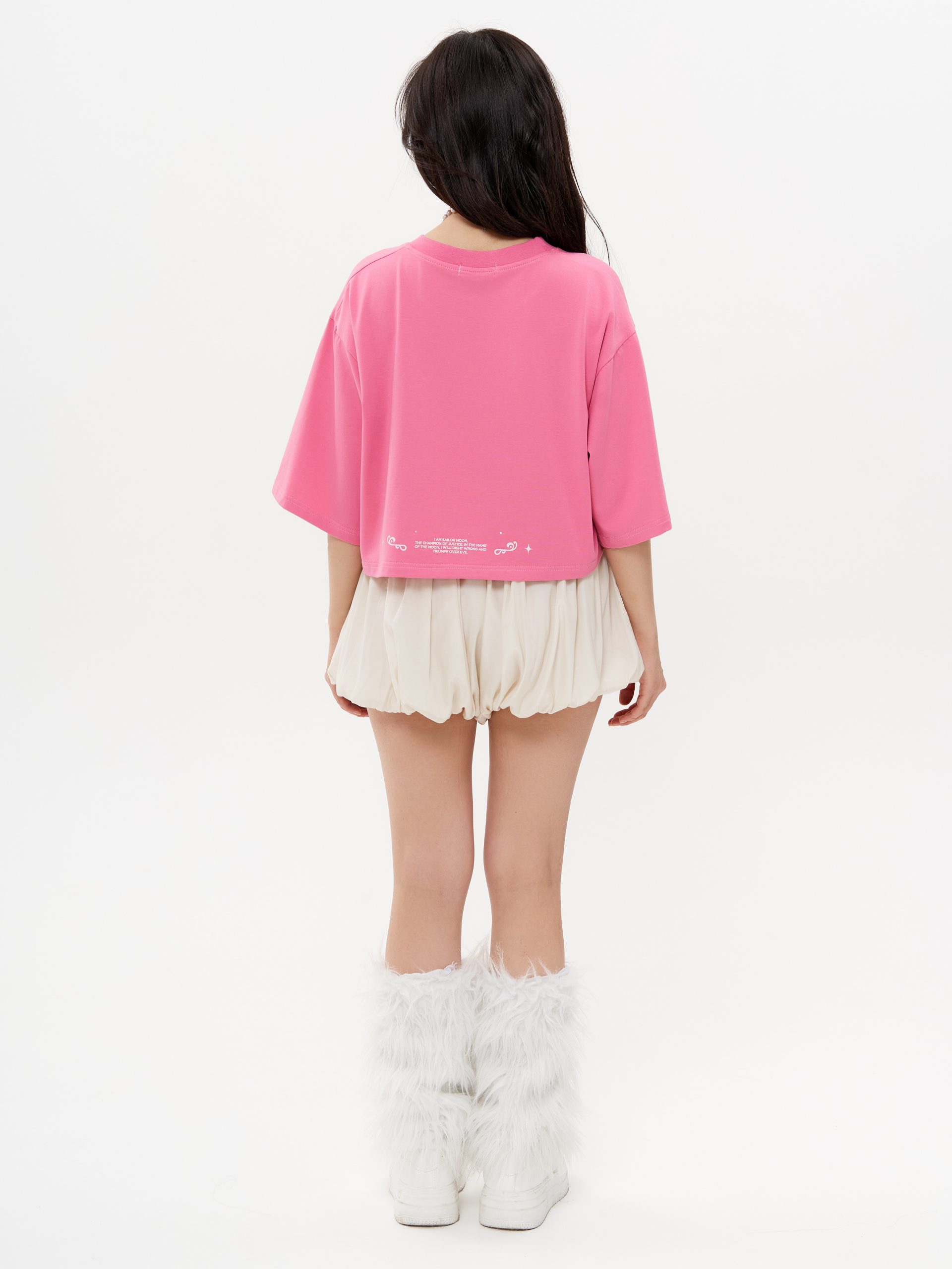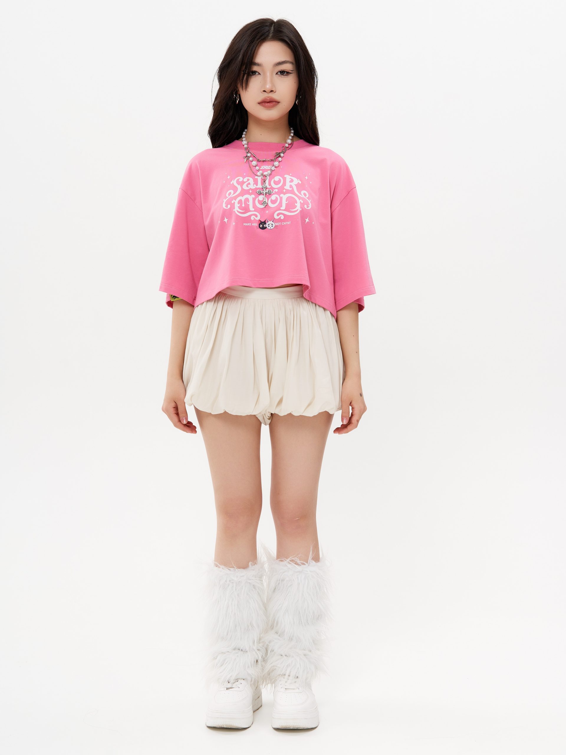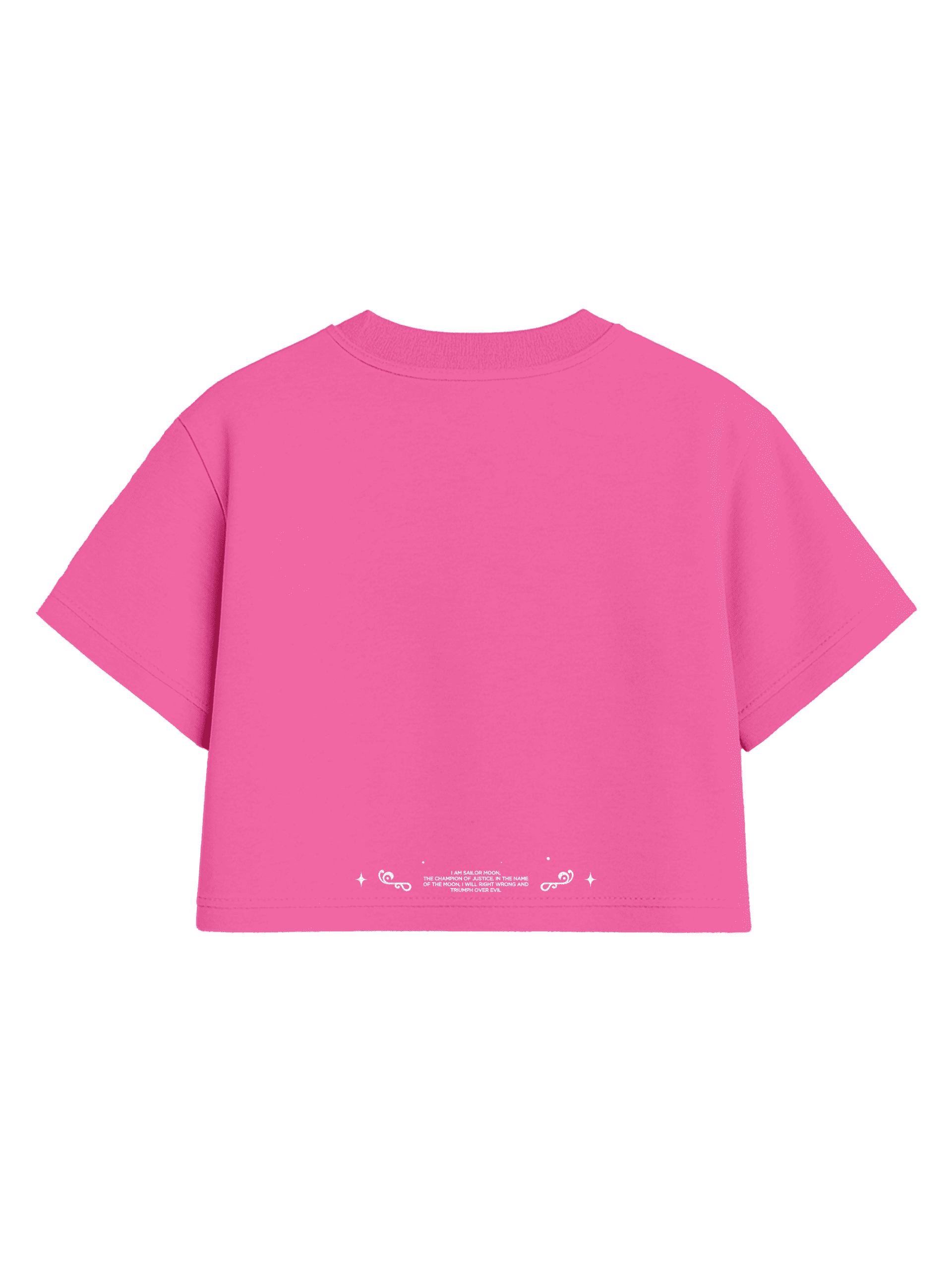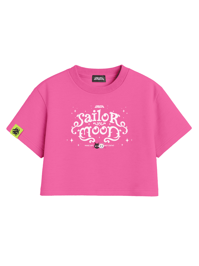 Лаконичный крой, розовый фон и фирменный логотип Sailor Moon в декоративной типографике — в центре внимания.