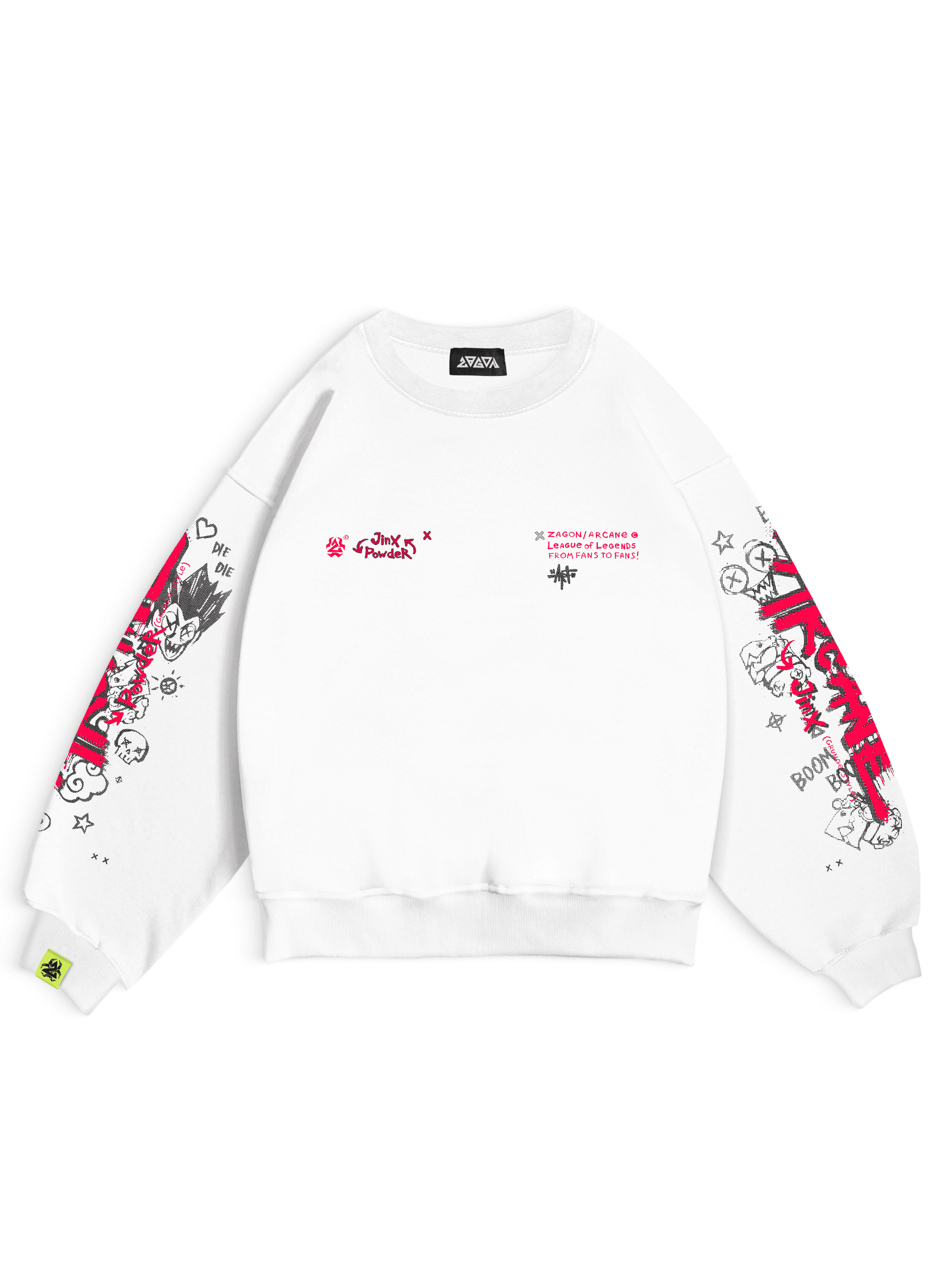 Белый свитшот, выполненный с различными оттенками красной палитры с элементами присущими Вселенной на рукавах, и изображением самой Джинкс сзади.