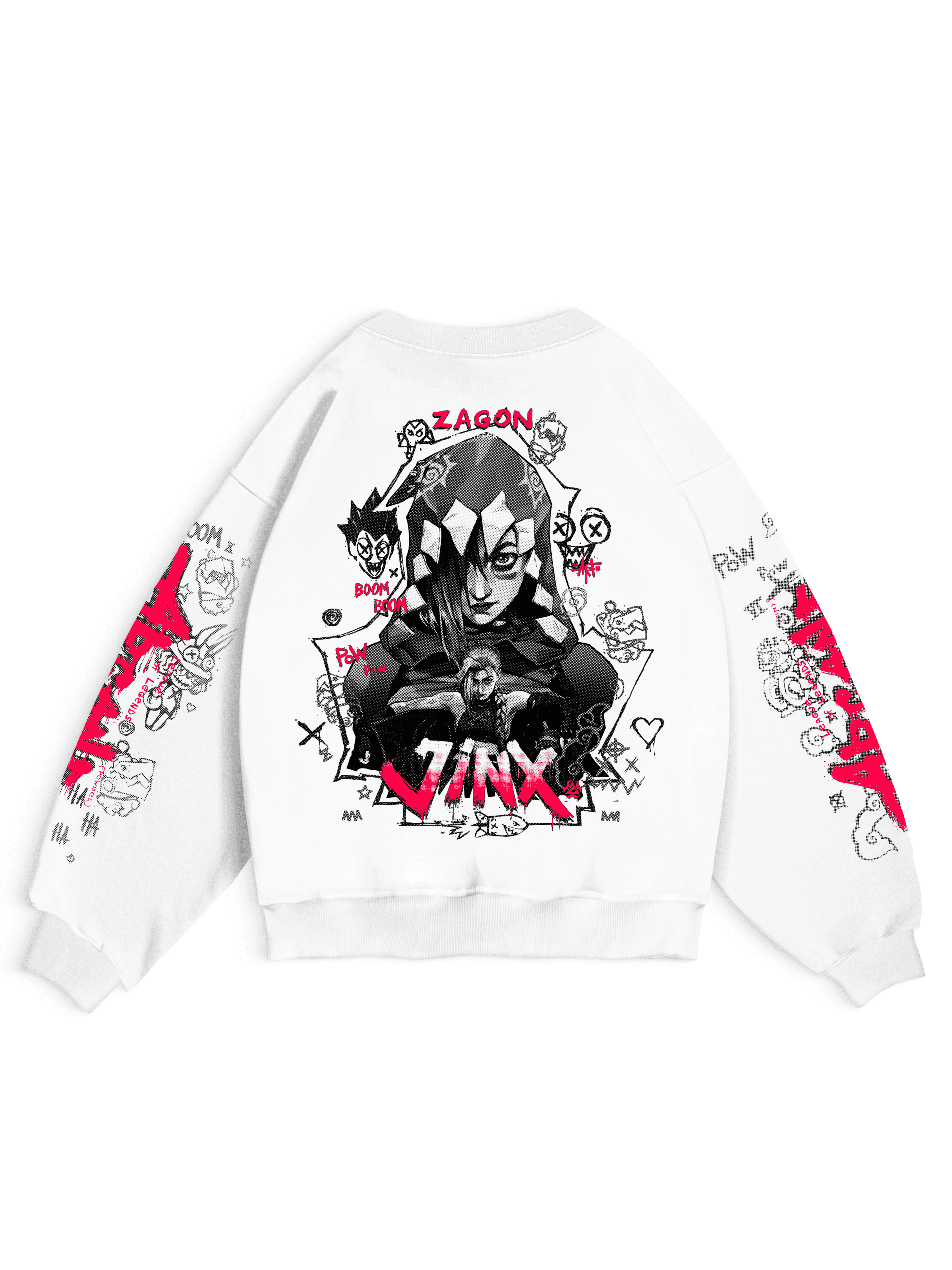 Белый свитшот, выполненный с различными оттенками красной палитры с элементами присущими Вселенной на рукавах, и изображением самой Джинкс сзади.
