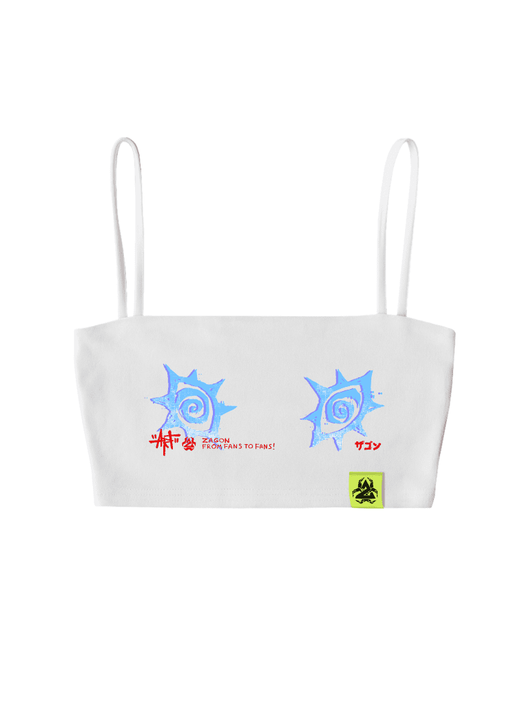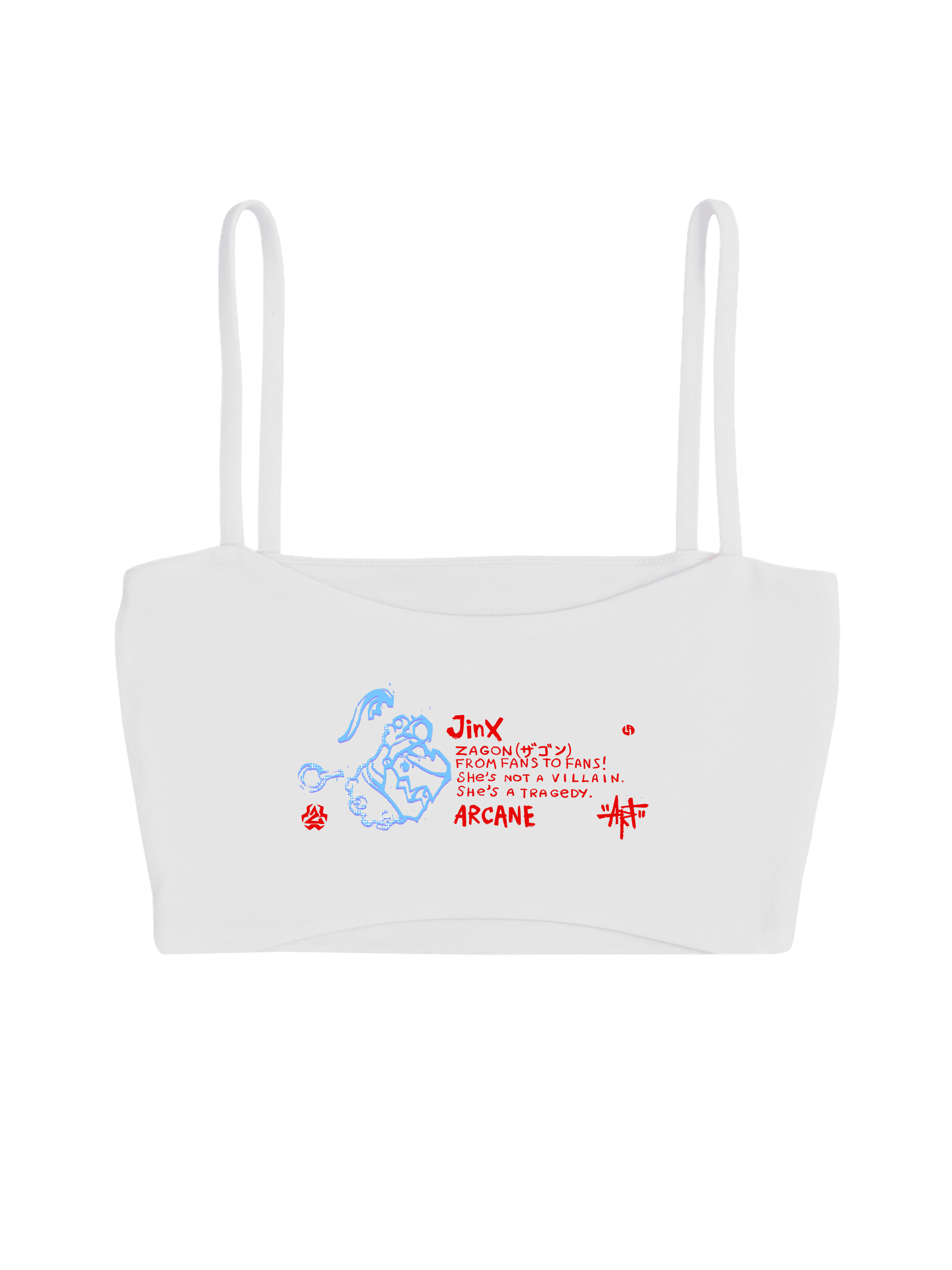 Минималистичный топ на тонких бретелях с эстетикой «Arcane», гранатой «кусакой» Джинкс и надписью «She’s not a villain, she’s a tragedy», передающей печальную судьбу Джинкс.
