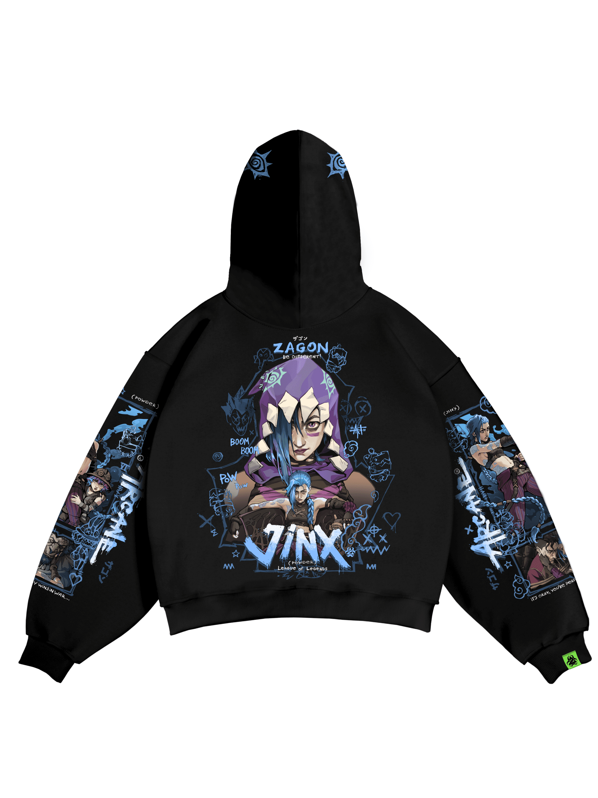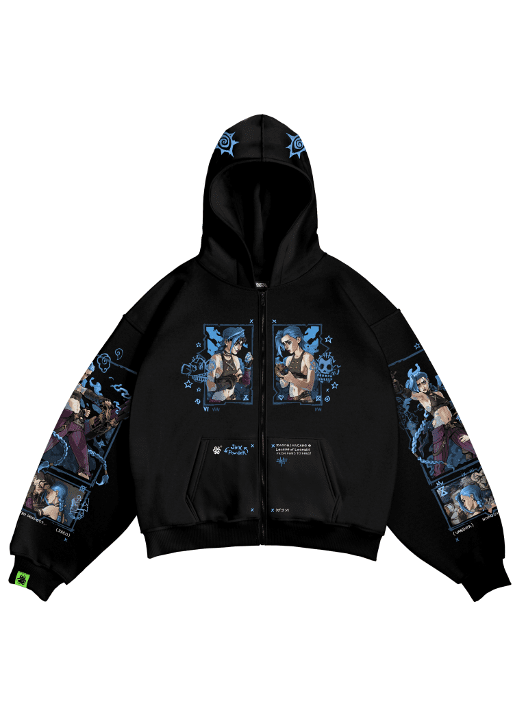 На груди — Джинкс и Паудер как контраст прошлого и настоящего, украшенный деталями и элементами, присущими тайтлу.